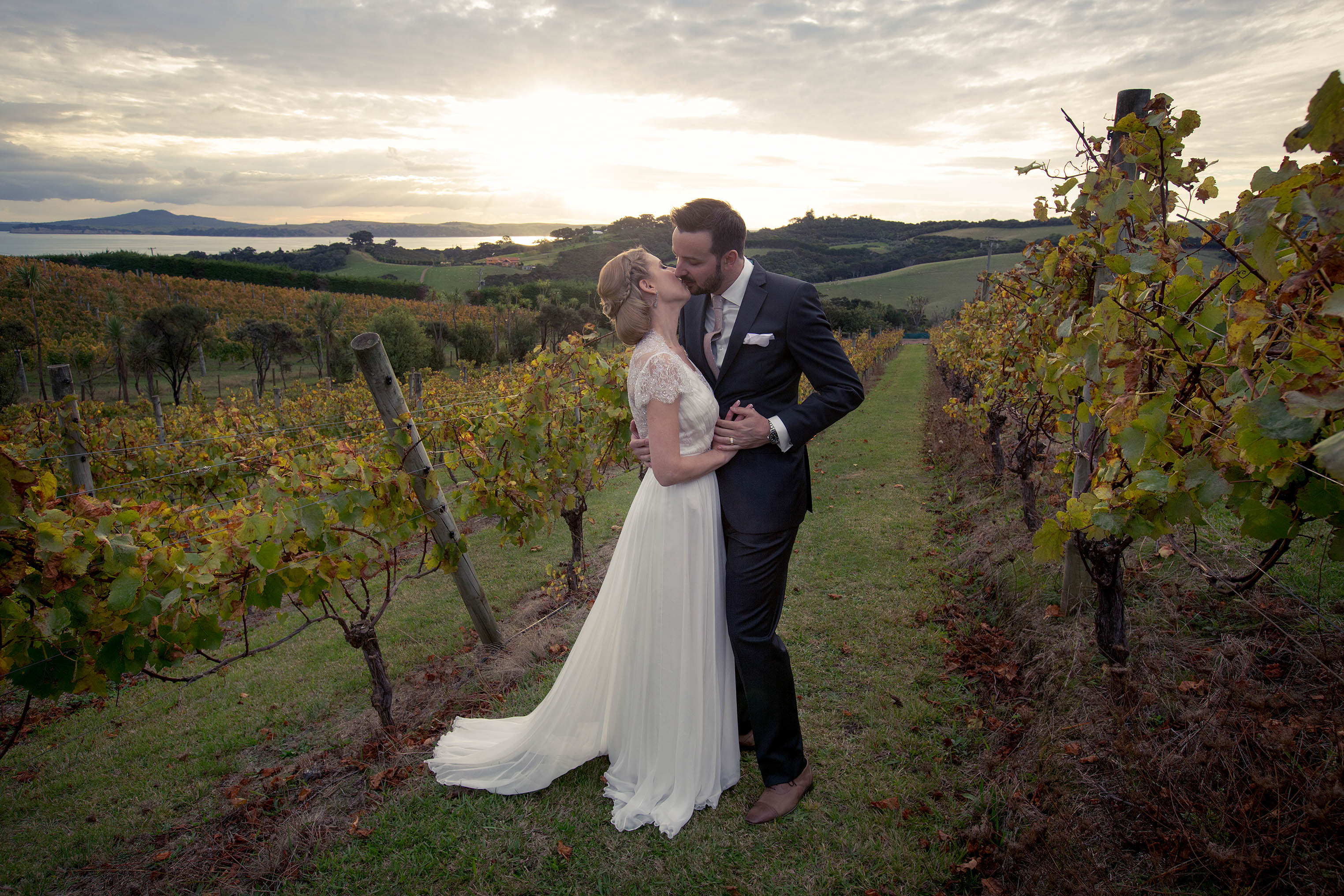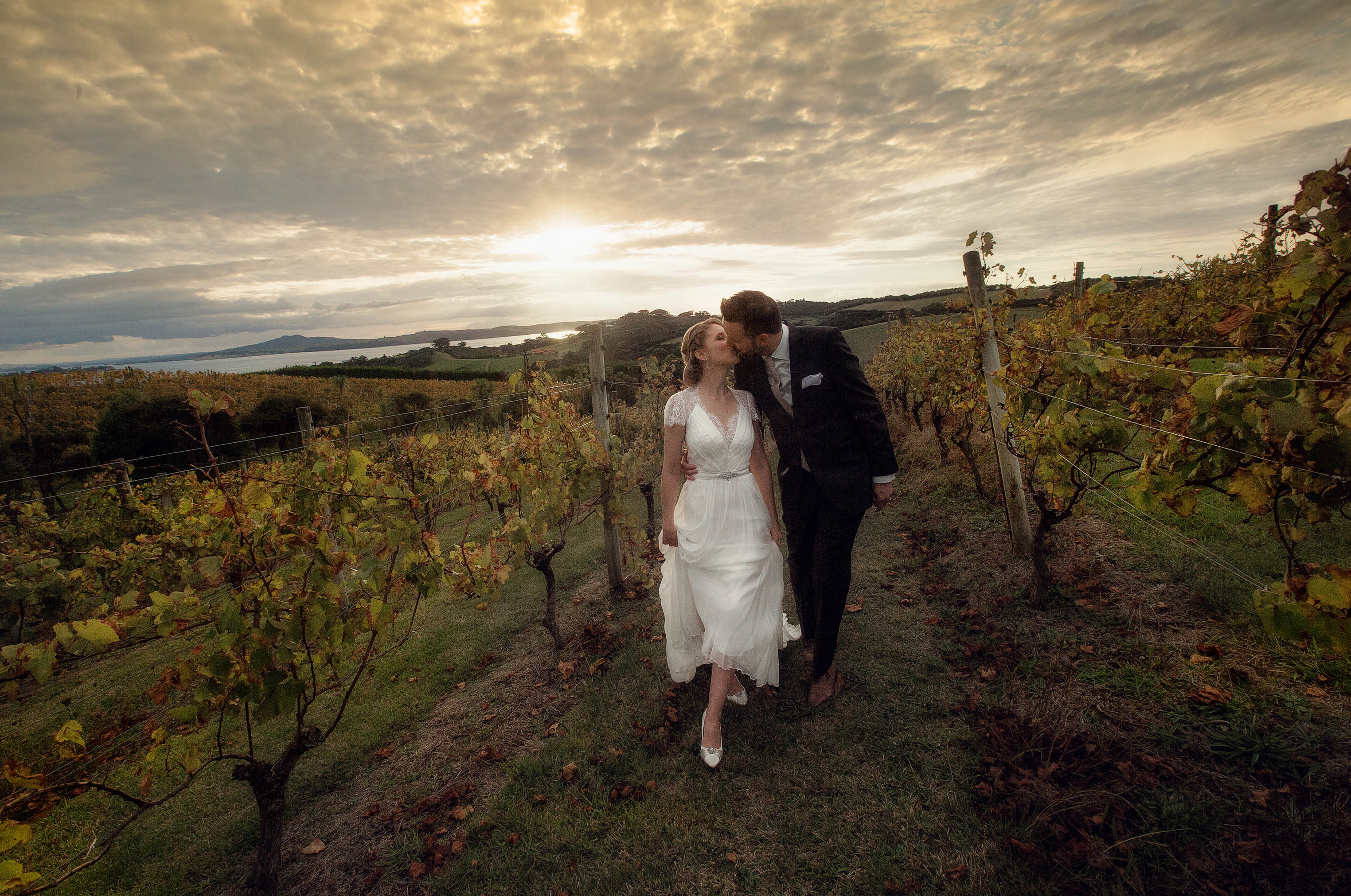 Just half an hour from Auckland lies the beautiful island of Waikeke with its rolling green pastures, gorgeous sandy beaches and of course world famous wineries, every popular venues for couples to choose for their wedding ceremony, reception and wedding photographs. And where better than Mudbrick. A favourite location for many an Auckland wedding photographer and it’s certainly one of mine. When ever I visit Mudbrick with my wedding clients for our pre-wedding photography planning meeting we always seem to be able to find a new and undiscovered spot that adds a charming uniqueness to their wedding photographs. It was no different for Ben & Lichelle who were married in the soft glow of the afternoon’s fading light.